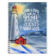 Inspirational quote scripture notebook, journal depicts a watercolor lighthouse with the light shining through the blue snow filled night sky. It features a portion of Bible Verse Isaiah 60:20, "The Lord will be your everlasting light."