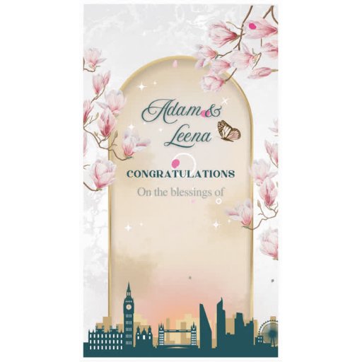 Soft watercolor magnolia blooms frame a gentle arch over a pristine marble-style background. These florals—painted in warm blush and pink tones—symbolize love, renewal, and spiritual beauty. With space to include both parents’ and grandparents’ names, this design is perfect for Muslim weddings that honor heritage, family, and faith.