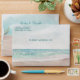 Island Breeze Painted Beach Scene, with Ocean Waves, Sandy Beach, and Palm Trees, with a beautiful teal blue sky. With Modern Typography Script Fonts. A Summer Tropical Beach, Or destination wedding design - Personalised Wedding Monogram Envelopes with Inside Design!