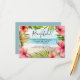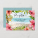 Step into a tropical paradise and inform your guests of your reception details with these island inspired enclosure cards featuring a watercolor sandy beach and turquoise ocean waves background bordered by pink and coral hibiscus flowers and palm tree leaves.
