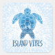 A stylised sea turtle in shades of blue features palm tree silhouettes and flying sea birds within its shell. Bold text beneath the turtle reads ISLAND VIBES invoking a tropical and relaxed vacation atmosphere. Tags: sea turtle, palm, sun, sunset, turtle, sea, tropical, reptile, sunrise, beach, vacation, cruise, isle, island, paradise, utopia, bliss, holiday, relax, peace, chill, serene, island vibes, sea life, ocean life, marine life, bird, seagull, gull, tree, positivity, relaxation, palm trees, caribbean, retired, summer vibes