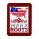 Isle of Man Manx American Flex Magnet. USA Map with a blended American and Isle of Man flag. With the text MANX ROOTS at below tree roots.