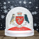Patriotic Isle of Man Snow Globe featuring frosty snowflakes background falling behind the Isle of Man emblem (blue sky glimmer on the back) & Isle of Man Flag color, winter Christmas decoration, holiday gifts for British patriots / sports fans.