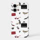Add a name to personalise the It Girl phone case. The pattern consists of shoes (high heel sandals and pumps) and accessories (makeup, sunglasses, a clutch purse, and handbag). The colour palette is leopard print, black, red, and white.