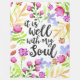 Modern hand-lettered style typography design with words, "It is Well with my soul" words from the well-known hymn. Type is surrounded by colourful watercolor flower border on all sides.