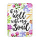 Modern hand-lettered style typography design with words, "It is Well with my soul" words from the well-known hymn. Type is surrounded by colourful watercolor flower border on all sides.