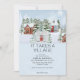 The background showcases a cosy, illustrated winter village scene, complete with snow-covered rooftops and pine trees, setting the tone for a magical and memorable gathering. Light blue snowflakes drift gently across the design, complementing the winter aesthetic and soft colour palette, making it ideal for a seasonal celebration full of warmth, love, and togetherness.