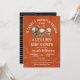 Spooky-cute gender neutral Halloween-themed baby shower invitation with the quote "It takes a haunted village to raise a boo" with a watercolor orange background on the front and a black and white pattern with stripes on the back. Featuring 3 adorable baby toys, teddy bears, and creepy spider webs. This invite sets the tone for a fun and eerie fall celebration honouring the mum-to-be. Fully customisable with name, date, event details, and rsvp information. Great for families planning a festive boy or girl baby shower in October.