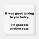 For the sarcasm lover in all of us. Check out this witty “It Was Great Talking to you Today. I'm Good For Another Year” design on apparel, mugs, mousepads, buttons, and other unique gifts.