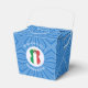 Take out favour box with an Italian angel wearing the flag of Italy for holiday party decorating or Hanukkah decor. The angel is found inside a white, fractal circle of squiggly squares. The background is a blue fractal of squiggly squares. Add your own text or personalise with a name and the year. Make your Hanukkah party special with take out favour boxes.