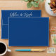 A retro modern bright vivid blue and cream wedding envelope. Which features handwritten whimsical cream beige bride and groom's names. And italian blue background colour. And personalised return address . Which suits the whole wedding suite.