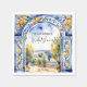 Italian Blue Majolica tiles arch with lemons bridal shower tableware personalised napkins, watercolor blue tiling arch and citrus with Italian landscape in the background, navy blue, white and yellow colour theme.