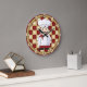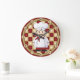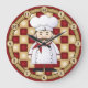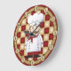 This old world clock has a chubby Italian chef wearing a red scarf, white chef's hat, red pants against a pizza coloured chequered background and he's ready to cook and ready to decorate your kitchen.
