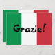 Thank you, or grazie, in Italian against the colours of Italy's flag. You can change the text style, size and colour. If you add information to the back of this invite, you can remove the image on the back side if you want a solid colour background.