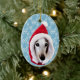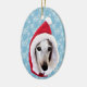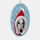 Italian Greyhound in santa hood with light blue and white snowflake background.