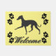 Italian Greyhound silhouette with paw prints and "Welcome" text in black on a yellow background.