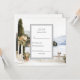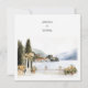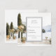 Perfect design for your wedding RSVP card : watercolor painting captures the timeless elegance of an Italian lakeside promenade, likely inspired by Lake Como. A stone walkway shaded by a vine-covered pergola extends along the waterfront, flanked by potted flowers and cypress trees. The serene blue lake mirrors the surrounding misty mountains and rolling hills. Across the water, a historic villa with terracotta rooftops and arched facades stands prominently, with a bell tower rising gracefully in the centre. The entire scene is bathed in soft, natural light, evoking peace, beauty, and an old-world charm.