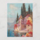 It is a beautiful Villa by the lake with cascading flowers. Mountains soar in the background. It is vintage.