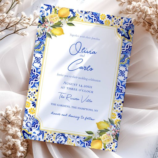 Italian Mediterranean Tile & Lemon Wedding Vellum Invitations