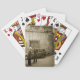 Playing cards with a sepia photo of two old men in Italy having a discussion on the street with a fiat car in the background, thereby creating a scene just like in an italian mafia Godfather movie.