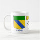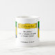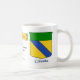Italian surname Columbo Historical Shield displays a blue diagonal stripe on a yellow field with a green top section. This is displayed twice on the mug along with the Blazon which is a description of the design on the shield in "heraldry speak".