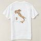 An editable title and slogan accompanies the green, white and red vertical bands of the Italian flag on the front of this t-shirt. The back displays a detailed map of Italy.