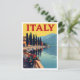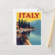 Capture the serene beauty of the Italian Lakes region with this striking retro-style travel postcard. The design showcases a beautiful waterfront promenade lined with classic Cypress trees and colorful lakeside villas, all set against dramatic blue mountains. The bold, vintage aesthetic perfectly conveys the tranquility and romance of a Northern Italian vacation. This postcard is a perfect souvenir or gift for lovers of classic European landscapes and art deco travel posters.