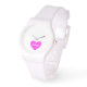 I had two concerns when ordering this watch - one that the watchband didn't look that glittery and two that the dial would be too large. Neither was a problem at all. The watch band is nice and glittery for a touch of bling. As to the size, I have small bones so I tend to like smaller looking accessories and I am quite comfortable with this. Neither too large or too small. The outside edge to edge on the dial is 1 1/4" the inside image is 1 inch.
