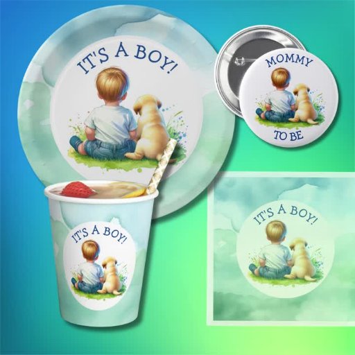 It's a boy Baby Shower paper cups. A baby boy sitting next to a Labrador Puppy Dog watercolor style ai art.