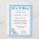 Cute baby in a blue shirt and diaper crawling across your baby shower invitation. It's a boy is written across the top. Customise with your party details.