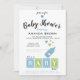 Cute baby boy shower invitation with a baby bottle silhouette in blue, little hearts in green and blue and kids cubes in green and blue.