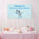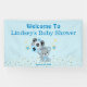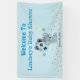 It's a Boy Blue Bear Balloons Banner. Cute grey bear with balloons that say, it's a boy. The background is blue and white dots with a splash of confetti and stars. Personalise with the name of Mum to be, and the date.
