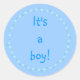 A blue background with a circle frame of polka dots, with, It's a boy, is printed on stickers. Fun colourful way to announce baby and baby showers.