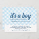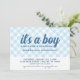 This baby shower card features a pastel blue and white gingham check background, evoking a sense of southern charm. The message "it's a boy" in stylish cursive lettering ensures the announcement is eye-catching while maintaining an air of casual elegance. The card reflects a classic preppy yet contemporary feel, suitable for celebrating the mum-to-be with a timeless design.