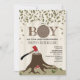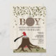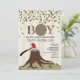 Baby shower invitation featuring an illustration of a wood disc incorporated into text "BOY" with an illustration of a tree stump with axe at bottom. Background is forest trees with leaves.