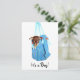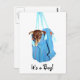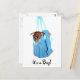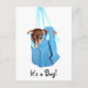 Brown and tan chihuahua puppy hangs in a diaper or tote bag and announces it's a boy. Text can be easily changed or removed