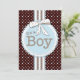 A sweet design of stripe and polka dot patterns in cute shades of baby blue and soft mocha, on a background of rich chocolate brown. A delightful layering effect is used to create a scrapbook look to both sides of the invitation. All elements are flat and part of the graphic image, but have an illusion of depth that gives visual interest to the overall look. Sweet bow and ribbon design in blue and white lets guests know for sure that a little boy is on the way - and all text on the back can be customised to suit your needs.