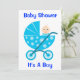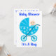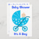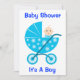 Adorable Baby Boy In a Blue stroller compliments this baby shower invitation, save the date with this: It's a boy Baby Shower! Customise the invitation to fit your needs and ideas