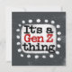 "It's A Gen Z Thing" is a cute text design in grey with black and red text, along with a white accent shape and white textured whimsical dots surrounding it.