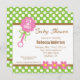 This adorable baby shower invitation features a girl theme with a pink baby rattle with the text: It's A Girl! The top and bottom border is lime green with white polka dots and light brown accents. The centre of the invite features customisable text for a shower details.