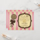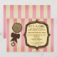 A vintage inspired baby shower invitation featuring a background of pink stripes on front and back. Front features brown and beige illustration of a rattle with a bow at left. Personalise the text inside matching antique inspired brown and beige frame at right.
