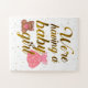 I did order the puzzle in a 30 Oversized pieces format - however the puzzle pieces were small and as a result the puzzle could not be presented at the time of the proposal as it wouldve been rather time consuming! The printing turned out fine. The majority of colours were crisp and clear except for the gold border around the text - which turned out somewhat greenish