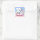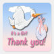 Features a light blue and pink gradient background, a stork carrying a baby Girl flying by a cloud. Stylised text is Thank You! Perfect sticker for baby shower thank you note cards, invitation envelope seals! Matching items including baby shower postage, baby shower invitations, Thank You note card & favour stickers are also available in our shop.