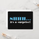 Shhh... it's a surprise birthday party invitation. With a black background, this invitation has bold robins egg blue "shhh..." and the words "It's a surprise!" in whimsical, trendy typography. The back side of the invitation features all of the party information.