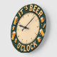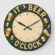 This is a wall clock featuring a dark green border and a light beige face. The phrase "IT'S BEER O'CLOCK" is written around the top and bottom in large, three-dimensional, light-colored block letters. The outer border is decorated with various sizes of illustrated beer mugs and glasses filled with foamy, golden beer. The hands and minute markings are black. The design may look real due to the high detail and three-dimensional texture in the artwork.