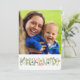 Decorative It's Christmas vertical personalised photo card with snowflakes, sprigs of leaves, berries, a deer, pear, and green text that reads CHRISTMAS with an area to add your photo on front, a green background with blue leaf sprig on back and an area to add your name and message as well as the current year.
