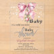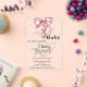 Cute baby shower invitation features a watercolor pink bow, Christmas balls, and string lights. These baby shower invitations are easily customized for your event by simply adding your details.