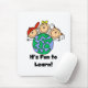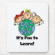 Three stick figure kids surround a world globe and text reads "It's Fun to Learn!" on school themed T-shirts, cards, mugs, stickers, buttons, and other gear!