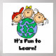 Three stick figure kids surround a world globe and text reads "It's Fun to Learn!" on school themed T-shirts, cards, mugs, stickers, buttons, and other gear!