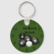 Pictured are four black lawn bowls with a jack and a clock face with words saying its Bowls oclock